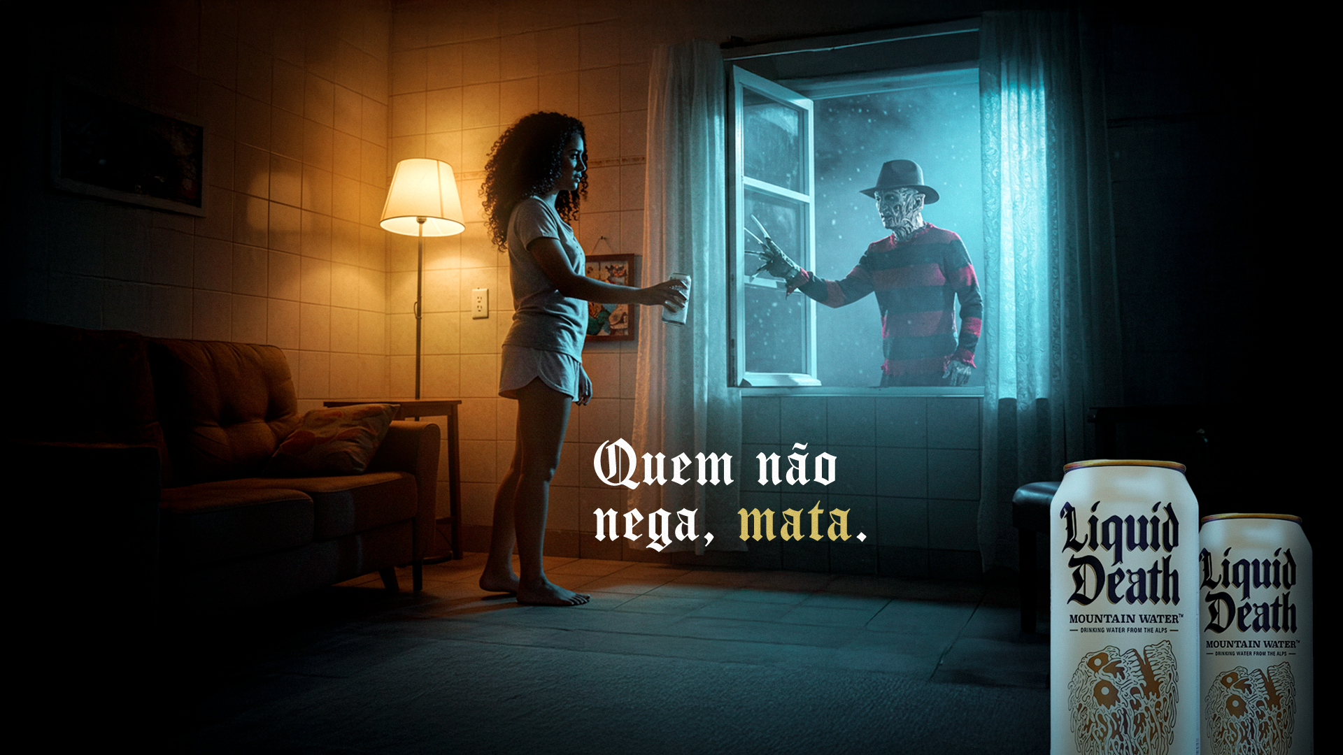A proposta era trazer a marca americana de água com gás Liquid Death para o Brasil, valorizando seu tom ácido e nada convencional de comunicar o produto.